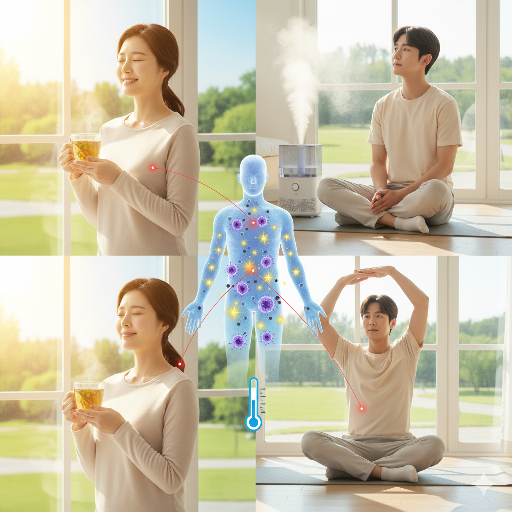 ✅ **체온 유지:** 따뜻한 물 자주 마시고, 실내 온도 20~22℃ 유지